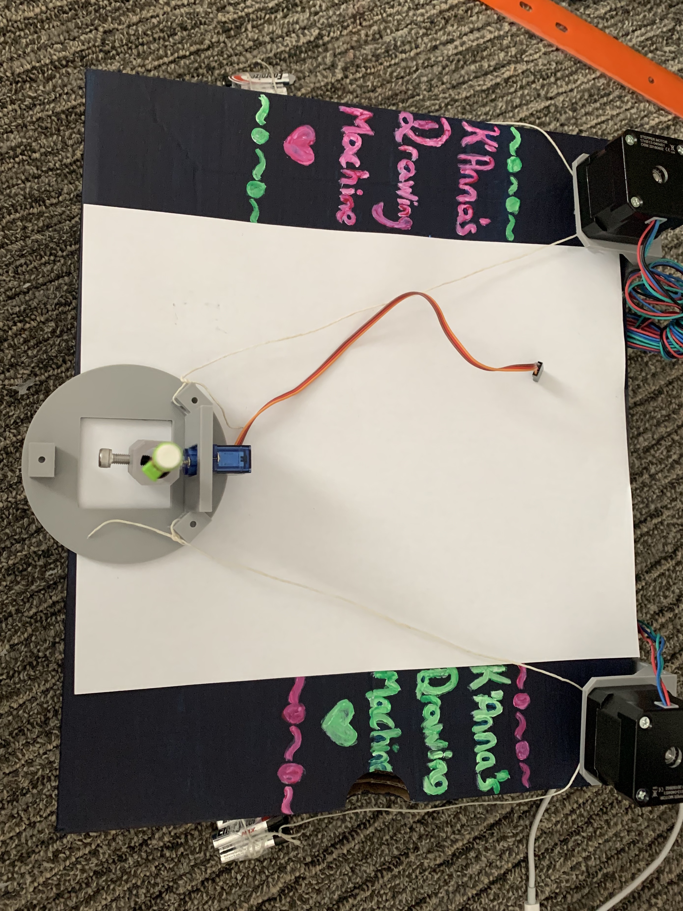 Then, I added the stepper motors, and the pen/ pencil holder (has servo motor attached). Following that, I added the strings to the holder and strung it around the steppers.